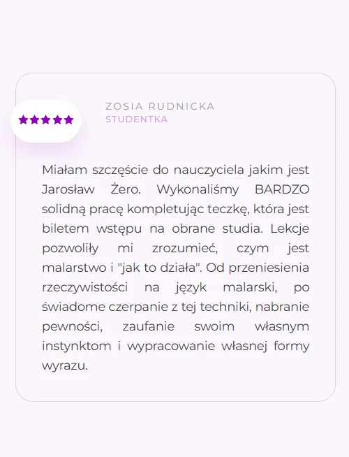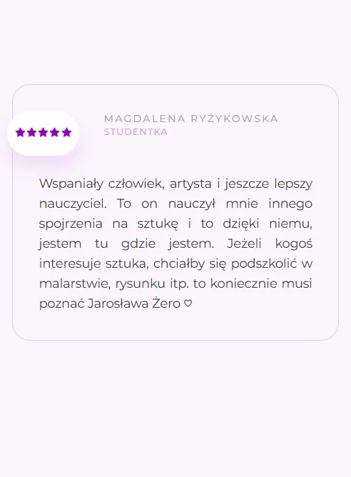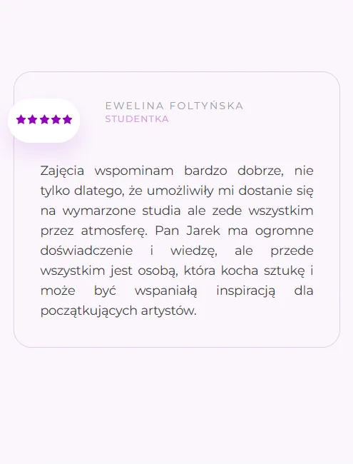 Dziękuję Jarkowi za perfekcyjnie przeprowadzone kursy z malarstwa i rysunku dzięki, którym z wielkim sukcesem dostałam się na Akademię Sztuk Pięknych w Łodzi. Od zawsze podziwiałam Jarka i jego pasje do sztuki, a każde zajęcia były zawsze urozmaicone i przeprowadzone w nietuzinkowym charakterze. Jeżeli poszukujecie nauczyciela z pasją i znakomitym humorem to dobrze trafiliście! Polecam Jarosława jako fantastycznego nauczyciela i mentora!