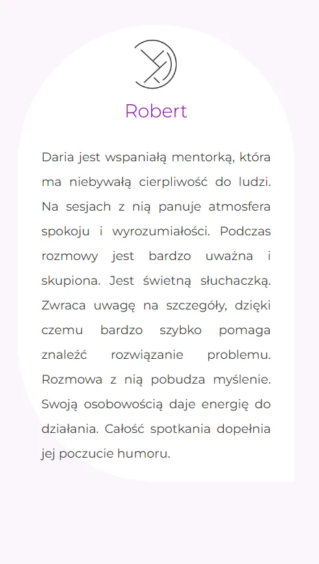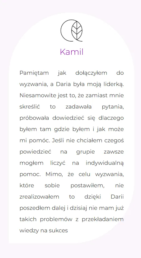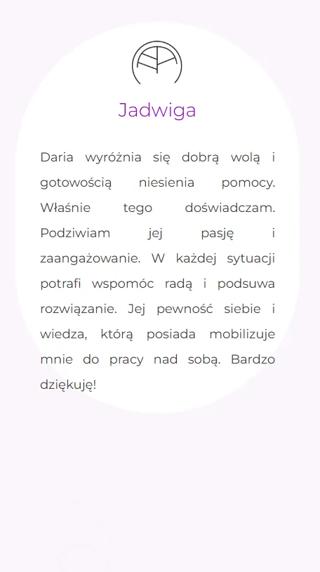 Daria jest osobą, która potrafi wydobyć z człowieka potencjał, pomaga i uzmysławia nam to czego nie widzimy, a jacy jesteśmy. Pracować z nią to czysta przyjemność. Bardzo serdecznie jej z tego miejsca dziękuję, ponieważ dużo wniosła w moje życie i bardzo pomogła mi dostrzec rzeczy, których ja nie dostrzegałam.